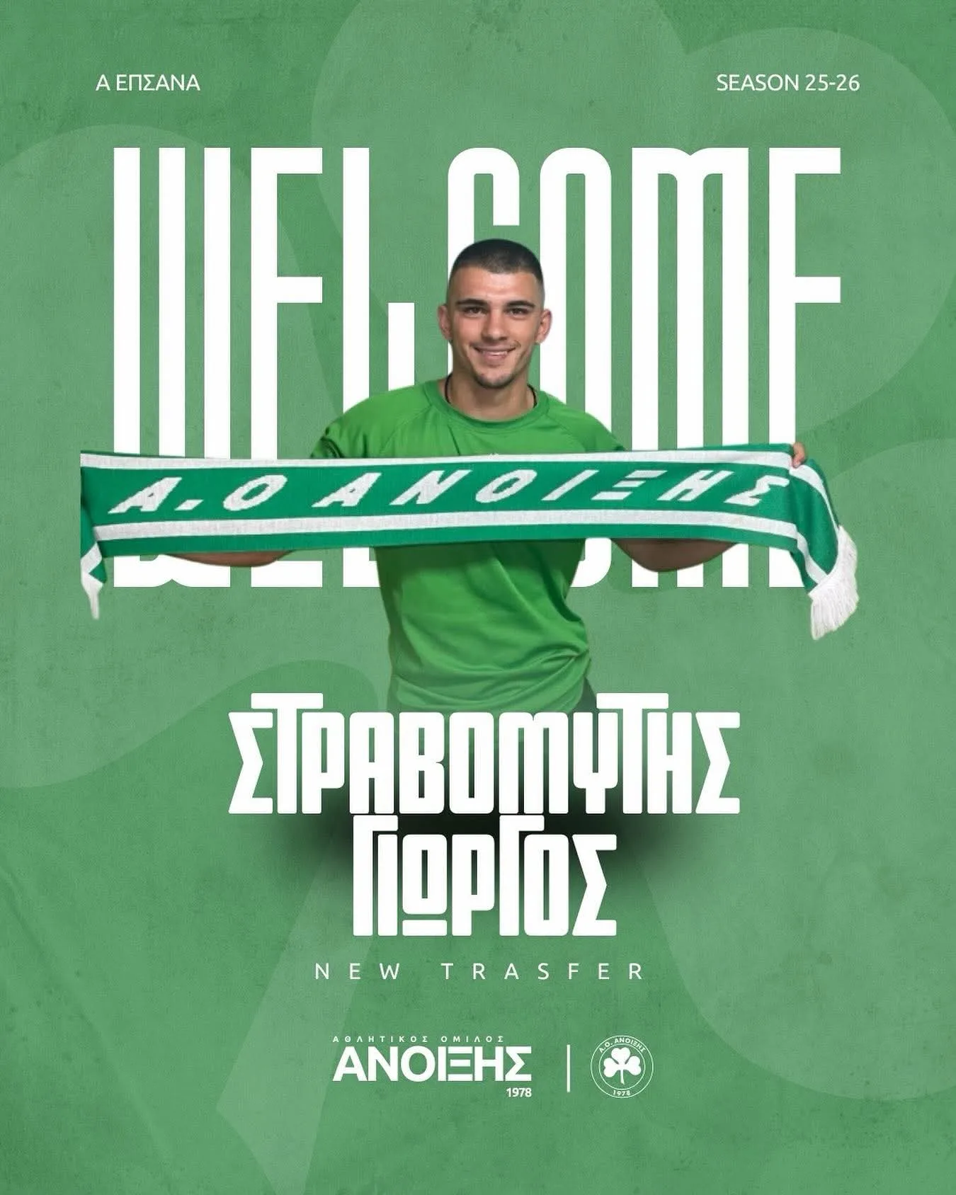 Τον καλωσορίζουμε στην οικογένεια του συλλόγου και του ευχόμαστε υγεία, πολλές επιτυχίες και μια δημιουργική αγωνιστική σεζόν. ☘️