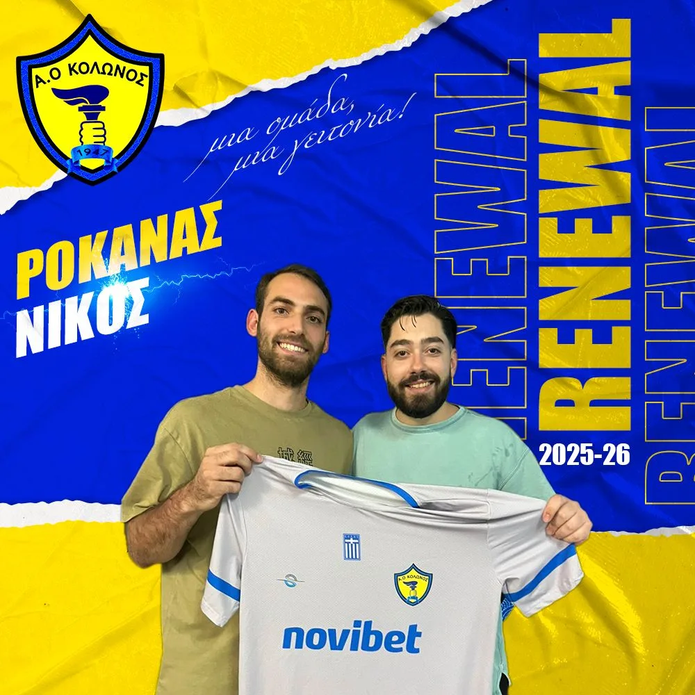 Το Διοικητικό Συμβούλιο του Α.Ο. Κολωνού ανακοινώνει, πως ο αρχηγός και φύλακας άγγελος της ομάδας μας, Νίκος Ροκανάς, θα υπερασπίζεται την εστία της αγαπημένης του ομάδας για ακόμη μια αγωνιστική περίοδο.