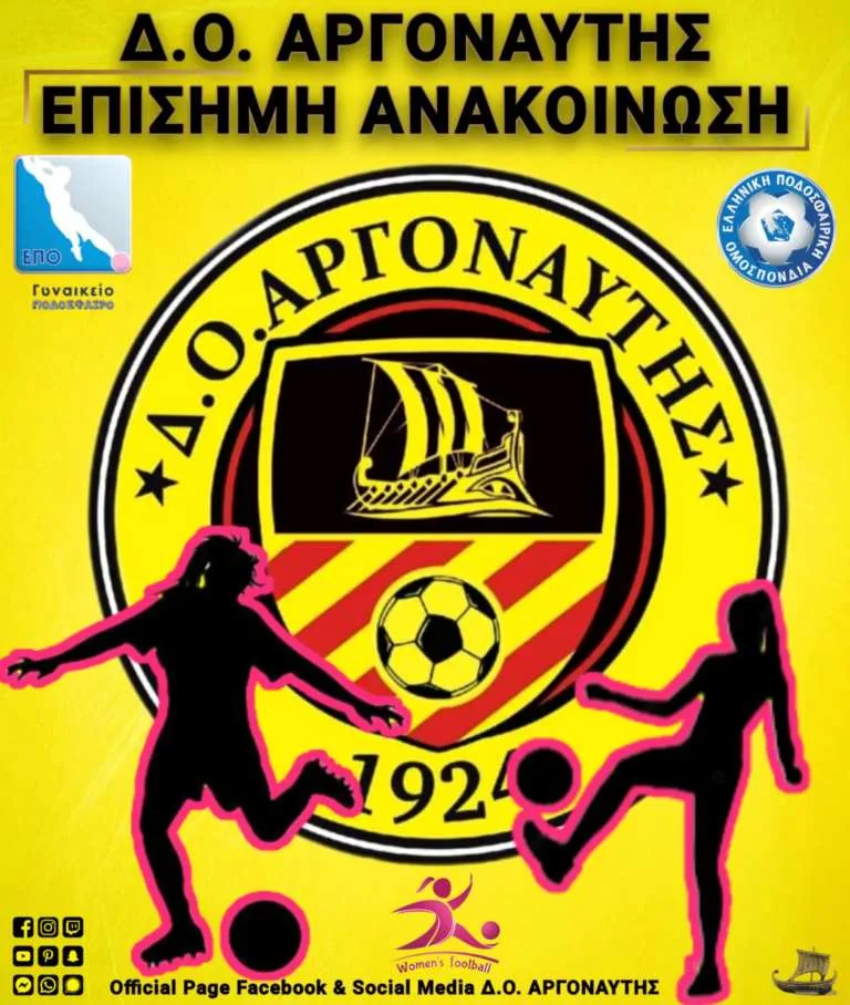 «Ο ιστορικός ΑΡΓΟΝΑΥΤΗΣ πλέον και στο γυναικείο ποδόσφαιρο! Με όραμα και στόχους για επιτυχίες! Είμαστε στην ευχάριστη θέση να ανακοινωσουμε επίσημα την δημιουργία γυναικείας ομάδας ποδοσφαίρου του ΑΡΓΟΝΑΥΤΗ Η επιθυμία του Προέδρου μας κ. Λιγνου Παντελή εδώ και χρόνια πλέον είναι πραγματικότητα!. Ο ιστορικοτερος σύλλογος του Χατζηκυριακειου και ένας από τους 3 μεγαλύτερους του Πειραια μεγαλώνει. Η ομάδα μας έχει ήδη κάνει σοβαρές ενέργειες και έρθει σε συμφωνία με πολύ έμπειρη καταξιωμένη προπονητρια, επίσης έχει έρθει σε συμφωνία με αξιόλογες παίκτριες επαγγελματικόυ επιπέδου που θα δώσουν μεγάλη δυναμική στην ομαδα μας. Τις επόμενες ημέρες θα ακολουθήσουν οι ανακοινώσεις. Το γυναικείο ποδόσφαιρο ανεβαίνει επίπεδα συνεχώς και αποτελεί για εμάς στον Αργοναυτη εξίσου σημαντικό κομμάτι του συλλόγου όσο και το ανδρικό τμήμα με στόχους και όραμα για το παρόν και το μέλλον! Θα κάνουμε τα πάντα να προσφέρουμε στις αθλήτριες της ομάδας μας και στις γυναίκες του συλλόγου παρόμοιες επιτυχίες όπως στο ανδρικό μας. Στυλοβάτης της προσπάθειας και νέας προσπάθειας ο Γενικός Αρχηγός κ. Χρυσόστομος Κωστοπουλος(ΤΗΛΕΦΩΝΟ-6975527350) και ο Γενικός Διευθυντής της γυναικείας ομάδας και των ακαδημιών μας κ. Φώτης Μαθιουδακης(ΤΗΛΕΦΩΝΟ-6976840572). Θα ανακοινωθούν ημερομηνίες δοκιμαστικών προπονήσεων για την στελέχωση της γυναικείας ομάδας σύντομα αναλυτικά. Η γυναικεία ομάδα ποδοσφαίρου του ΑΡΓΟΝΑΥΤΗ είναι εδώ πλέον!!!!!! Κάτι σπουδαίο δημιουργείται!!!!!!!».