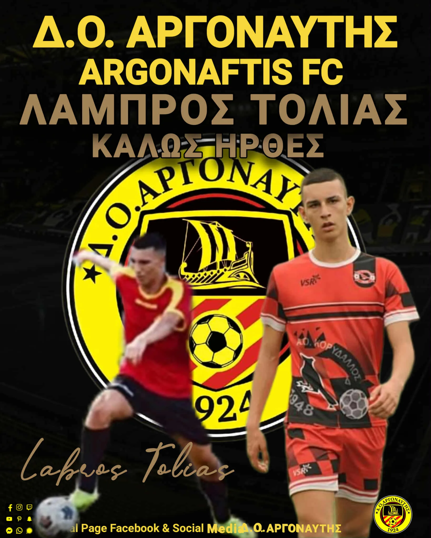 Ο Αργοναύτης συνεχίζει να επενδύει στα κορυφαία ταλέντα και νέα παιδιά με μέλλον στο ποδόσφαιρο. Είμαστε στην ευχάριστη θέση να ανακοινωσουμε επίσημα την απόκτηση του νεαρού ταλαντούχου μεσοεπιθετικου Λάμπρου Τόλια. Το προπονητικό τιμ της ομάδας με επικεφαλή τον προπονητή μας κ. Θωμά Μέτο έχει παρακολουθήσει πολλά ταλέντα και ένα από αυτά που ξεχωρίζουν είναι το νέο απόκτημα της ομάδας μας ο Λάμπρος Τόλιας. Ο Τόλιας είναι γεννηθείς το 2008 (17 ετών) και αγωνίζεται ως μέσος και ως δεύτερος επιθετικός. Είναι υψηλοσωμος και διαθέτει ταχύτητα που του δίνει μεγάλο διασκέλισμο με και χωρίς την μπάλα στα πόδια. Ο Λάμπρος Τόλιας είναι ένα παιδί με ήθος και ατόφιο ταλέντο και μπορεί με σκληρή δουλειά να διακριθεί με την ομάδα μας. Έχει αγωνιστεί σε ΑΟ Κορυδαλλού και πλέον θα φοράει την κιτρινόμαυρη φανέλα του Ιστορικού Αργοναυτη. Λάμπρο καλώς ήρθες στην οικογένεια μας! Σου ευχόμαστε υγεία πάνω από όλα και πολλές επιτυχίες με την ομάδα μας!