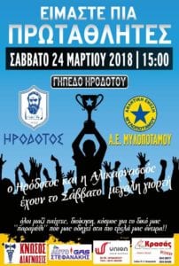 Με το σύνθημα που αναγράφεται να είναι το… είμαστε πια πρωταθλητές ο Ηρόδοτος ανάρτησε στην επίσημη σελίδα του στο facebook την αφίσα για τον αγώνα-φιέστα με την ΑΕ Μυλοποτάμου.