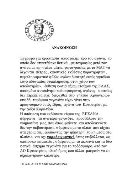 Σκληρή ανακοίνωση εξέδωσε το ΔΣ της Μάχης Μαραθώνα σχετικά με την απόφαση της Πειθαρχικής Επιτροπής της ΕΠΣΑΝΑ για τα επεισόδια στον αγώνα της ομάδας του Μαραθώνα με το Κρυονέρι. Διαβάστε παρακάτω τι αναφέρει: