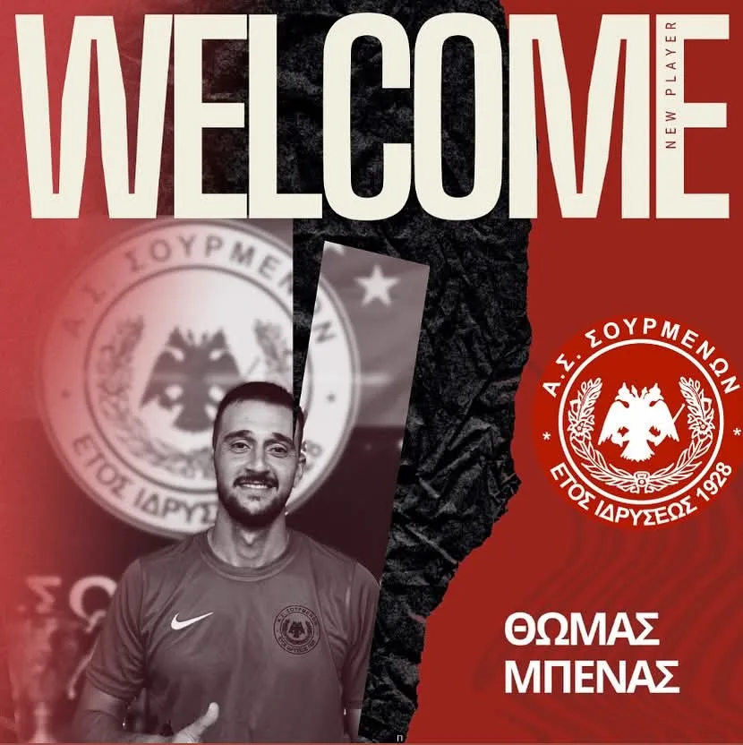 Ο Πρόεδρος Βασίλης Βάσσιος και το Διοικητικό Συμβούλιο του Αθλητικού Συλλόγου Σουρμένων με ιδιαίτερη ικανοποίηση ανακοινώνουν την έναρξη συνεργασίας για τη νέα αγωνιστική περίοδο με τον έμπειρο μεσοαμυντικό ποδοσφαιριστή Θωμά Μπένα.