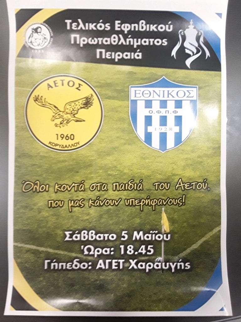 “Η Διοίκηση του Αετού Κορυδαλλού επ΄ ευκαιρία της συμμετοχής του εφηβικού μας τμήματος στο Μεγάλο Τελικό της ΕΠΣΠ, καλεί γονείς και αθλητές της Ακαδημίας καθώς και τους φιλάθλους της ομάδας να δώσουν βροντερό παρόν στη μεγάλη αυτή γιορτή που διοργανώνει η Ένωση και θα διεξαχθεί το Σάββατο 5 Μαΐου 2018 και ώρα 18:45 στο γήπεδο ΑΓΕΤ – ΧΑΡΑΥΓΗΣ με αντίπαλο τον Εθνικό Πειραιά.
