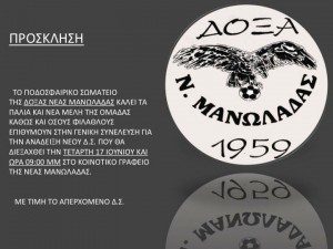 Ανακοίνωση εξέδωσε η Δόξα Νέας Μανωλάδας μέσω της οποίας γνωστοποιεί ότι η Γενική Συνέλευση του συλλόγου για την ανάδειξη νέας διοίκησης θα λάβει χώρα την ερχόμενη Τετάρτη 17 Ιουνίου στο κοινοτικό γραφείο της περιοχής. Αναλυτικά, η ανακοίνωση της αφίσας: