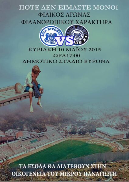 Το κοινωνικό της πρόσωπο θα δείξει για ακόμη μια φορά η Δόξα Βύρωνος καθώς για αύριο έχει προγραμματιστεί να λάβει χώρα φιλανθρωπικός αγώνας στο δημοτικό στάδιο της Περιοχής. Συγκεκριμένα, η πρώτη ομάδα θα αντιμετωπίσει την ‘Blue Army’ και τα έσοδα θα διατεθούν στην οικογένεια του μικρού ΠΑΝΑΓΙΩΤΗ ο οποίος κανει θεραπειες και δίνει την δική του μάχη κόντρα στην επάρατη νόσο. Πρέπει να δείξουν όλοι έμπρακτα τη συμπαράσταση τους