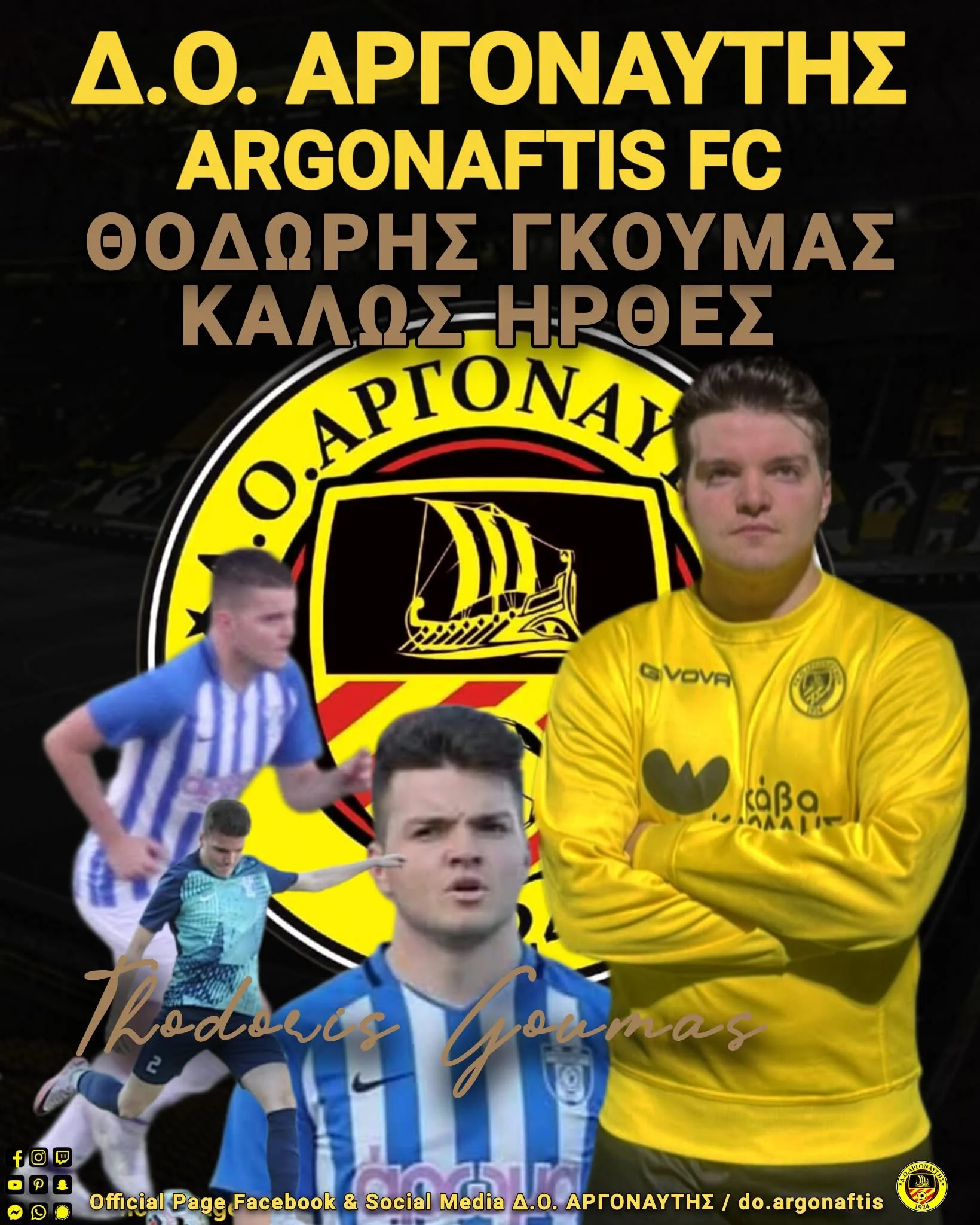 Μια πολύ σπουδαία μεταγραφή είναι γεγονός! Βρισκόμαστε στην ευχάριστη θέση να ανακοινωσουμε επίσημα πλέον την απόκτηση του νεαρού ταλαντούχου ακραιου μπακ Θοδωρή Γκουμα στην ομαδα μας! Μια μεταγραφή από το πάνω ράφι για τον Αργοναύτη μας ολοκληρώθηκε καθώς ο νεαρός ακραίος μπακ Θοδωρής Γκουμας έχει σπουδαίες χρονιές πρωταθλητισμου και παραστάσεις από την Γ’Εθνική. Ο Γκουμας αγωνίζεται κυρίως ως ακραίος μπακ και διαθέτει δύναμη, εμπειρία παρά το νεαρό της ηλικίας του και ικανότητες που θα δώσουν σημαντικές λύσεις στις πτέρυγες. Έχει αγωνιστεί σε ΑΕ Μοσχάτου, Ελλάς Ποντίων, Καραβά στην Γ’Εθνική με γεμάτες χρονιές με υψηλό ανταγωνισμό. Μία ακόμη σημαντική προσθήκη στο ροστερ της ομάδας μας. Θοδωρή καλώς ήρθες στην οικογένεια μας! Σου ευχόμαστε υγεία πάνω από όλα και πολλές επιτυχίες με την ομάδα μας!