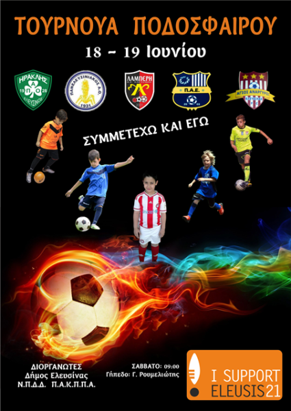 Στο πλαίσιο προβολής της πολιτιστικής πρωτεύουσας “ΕΛΕΥΣΙΝΑ 2021” και με μοναδικό σύνθημα “ΣΥΜΜΕΤΕΧΩ και ΕΓΩ”, διοργανώνεται υπό την αιγίδα του Δήμου Ελευσίνας, Τουρνουά Ποδοσφαίρου Ακαδημιών ηλικιακών κατηγοριών 2003-04 & 2005-06.