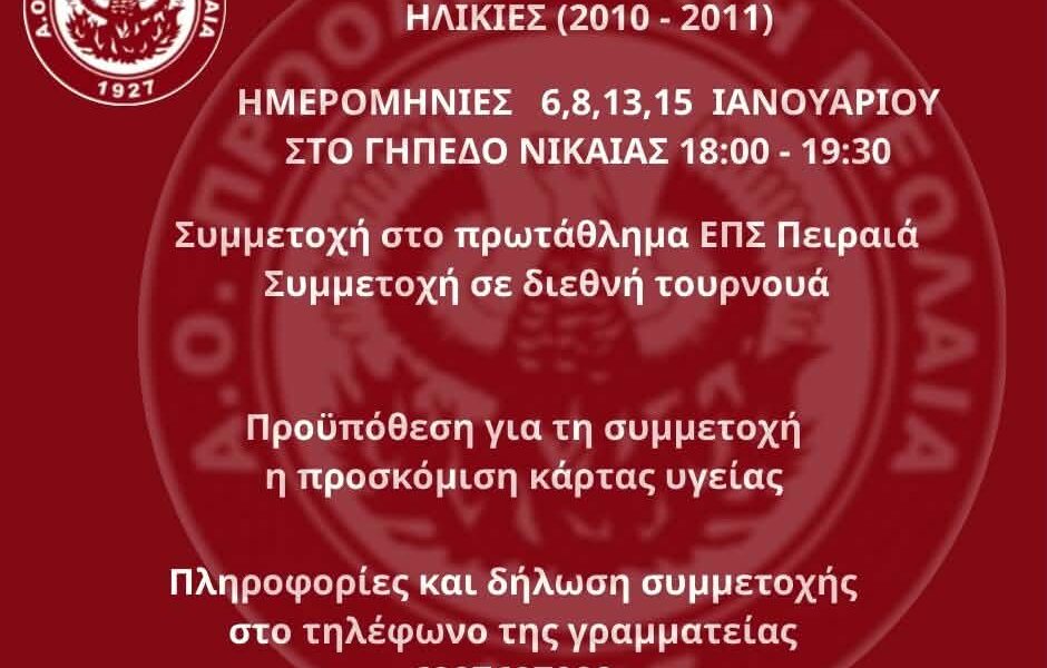 Η Ακαδημία της Προοδευτικής καλέι για δοκιμαστικά νεραών Κ16 (ηλικίες 2010-2011) στις 6,8,13,15 Ιανουαρίου στο Γήπεδό της Νίκαιας στις 18:00- 19:30. Συμετοχή στο πρωτάθλημα ΕΠΣ Πειραιά...