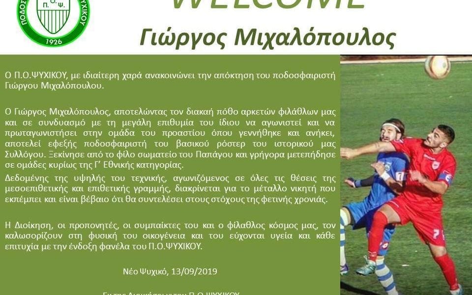 Την απόκτηση του Γιώργου Μιχαλόπουλου ανακοίνωσε ο ΠΟ Ψυχικού. Το δελτίο τύπου Ο ΠΟ Ψυχικού με ιδιαίτερη χαρά ανακοινώνει την απόκτηση του ποδοσφαιριστή, Γιώργου Μιχαλόπουλου. Ο...