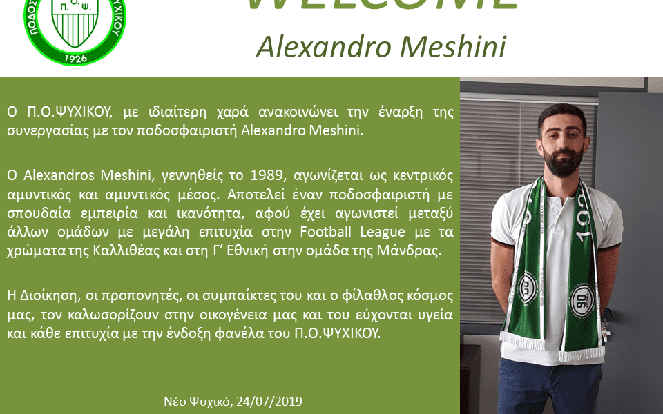 Ο ΠΟ Ψυχικού με ιδιαίτερη χαρά ανακοινώνει την έναρξη της συνεργασίας με οτν ποδοσφαιριστή Αλέξανδρο Μεσίνι. Ο Μεσίνι γεννηθείς το 1989 αγωνίζεται ως κεντρικός αμυντικός και...