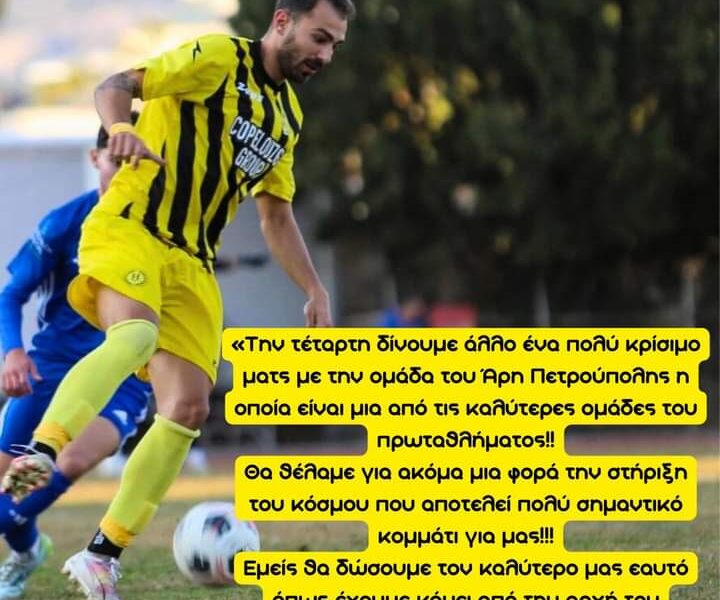 Την ακόλουθη ανακοίνωση εξέδωσε ο Άρης Πετρούπολης… 🔴🟠𝚻𝚮𝚴 𝚻𝚬𝚻𝚨𝚸𝚻𝚮 𝚶𝚲𝚶𝚰 𝚺𝚻𝚶 𝚪𝚮𝚷𝚬𝚫𝚶 𝚪𝚸𝚮𝚪𝚶𝚸𝚰𝚶𝚼 Για την 10η αγωνιστική ο Άρης Πετρούπολης την Τετάρτη 20/11/2024 στις 15.00 υποδέχεται...