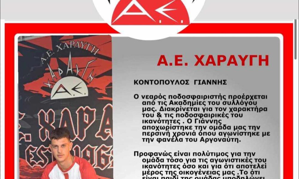 Το ΔΣ της Χαραυγής προχώρησε στην παρακάτω ανακοίνωση που ενημερώνει για την επιστροφή του Γιάννη Κοντόπουλου στον σύλλογο. «Ο νεαρός ποδοσφαιριστης προέρχεται απο τις Ακαδημίες του...