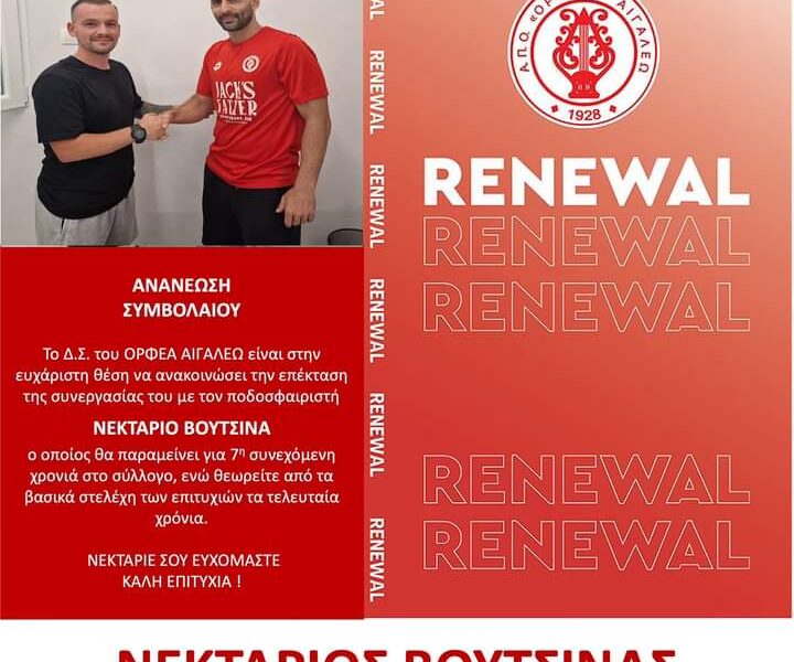 Την ανανέωση της συνεργασίας με τον ποδοσφαιριστή της ομάδας Νεκτάριο Βουτσινά ανακοίνωσε ο Ορφέας Αιγάλεω. Το δελτίο Τύπου… Το Δ.Σ. του ΟΡΦΕΑ ΑΙΓΑΛΕΩ είναι στην ευχάριστη...